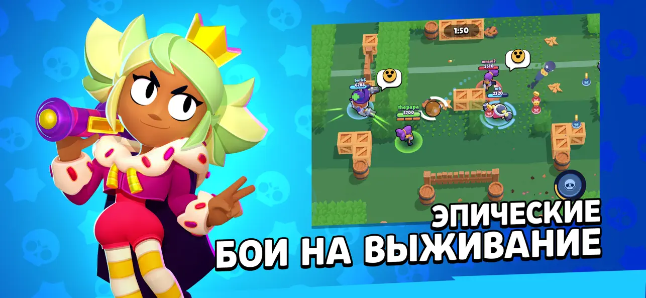 Brawl Stars – это молниеносные многопользовательские сражения для мобильных устройств, где вас ждут захватывающие 3×3 бои и безумная битва на выживание! Играйте соло или с друзьями в разнообразных режимах, где каждая схватка длится не больше трёх минут!